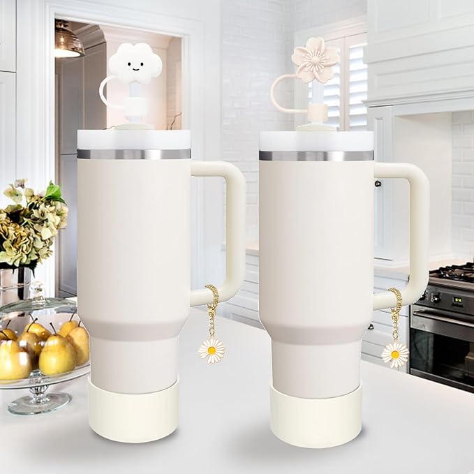 Stanley Cup Accessories Set,Including 2 Pcs 0.4in Straw Cover, 1 Silicone Spill-Proof Stopper Set of 3, 1 Cute Flower Handle Charm, 1 Silicone Boot Fits Stanley 40&30 Oz Tumbler (Cream)
