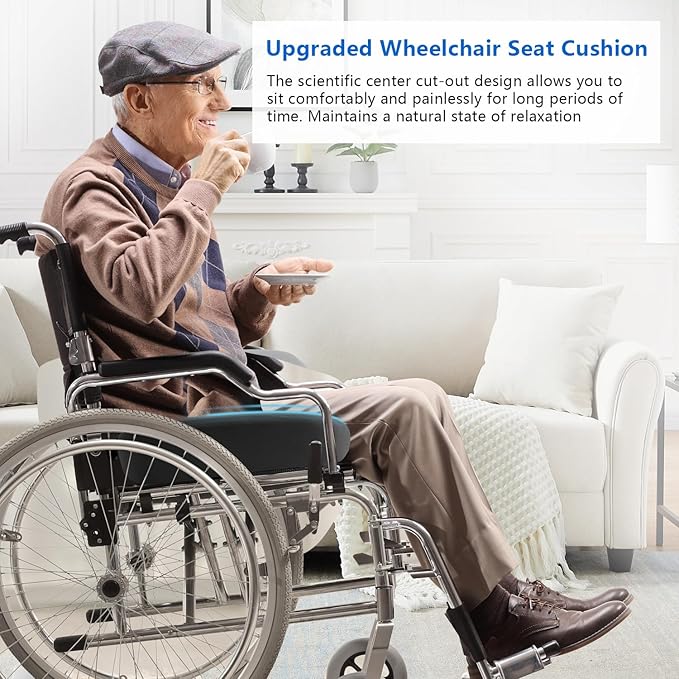 - [Ergonomic design]:Our wheelchair cushions are hollow in the middle to relieve pressure on the hips and tailbone. The size of this cushion (16.9" x 15.7 "x 4.3") is designed for most wheelchairs. Whether recovering from surgery, hemorrhoids, tailbone pain or office work, it's perfect for relieving the discomfort of sitting for long periods of time.