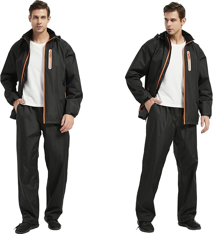 - Portable packaging and reflective strip design: The rainsuit is Lightweight and soft,easy packable,Takes up almost no space.The rain jacket and pants has reflective strips,this will reminder other people and car,Keep your safety on rainy nights