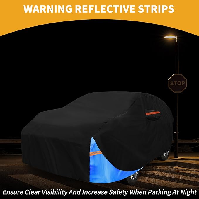 - [SIMPLY TO USE] The reflective strips in the car cover enhance nighttime visibility and parking safety. For added convenience, the right-side door zippers allow for easy access to the interior without the hassle of removing the entire cover, saving time and effort. The windproof elasticized hem around the wheels is designed to firmly hold the car cover in place even on gusty days, ensuring that the vehicle remains protected from the elements