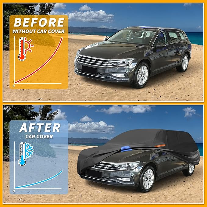 - [PRODUCT BENEFITS] Constructed from advanced 210D, the material's remarkable durability ensures that the cover can withstand various environmental challenges. The wear and tear resistance means it will last a long time even with regular use. The UV-resistant property is crucial as it shields your car's delicate surfaces from the harmful effects of the sun. The sun can damage car paint, the interior, and the dashboard. This car cover provides good protection