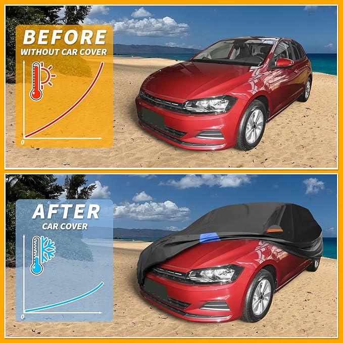- [ALL WEATHER PROTECTION] The full car cover's ability to resist weather is truly outstanding. Its design is engineered to provide maximum protection against the elements. Rain, snow, hail, and harsh sunlight can all cause significant damage to a vehicle over time. This car cover acts as a barrier, keeping these elements at bay. By preventing water from seeping into the car, it reduces the risk of rust formation and other types of damage that can occur when water gets inside