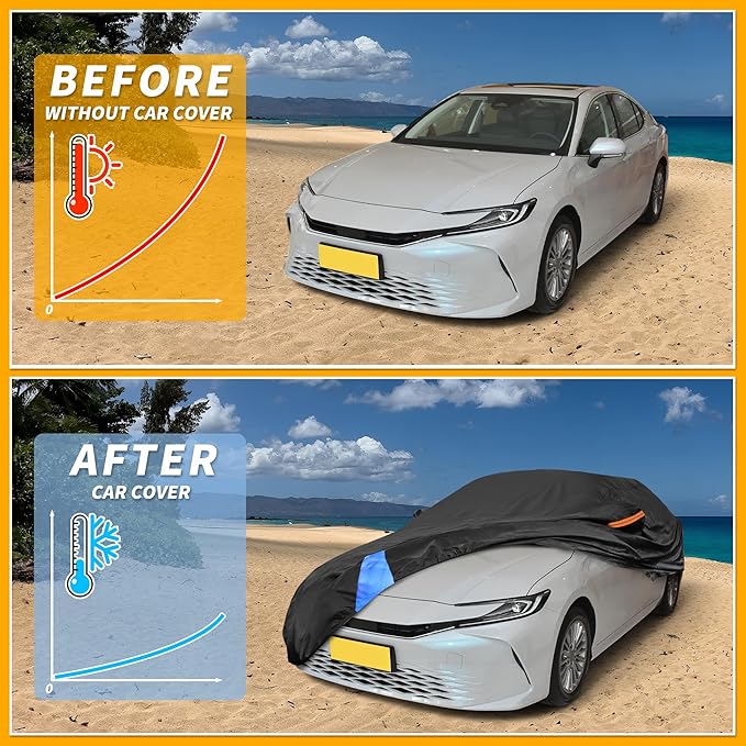 - [ALL WEATHER PROTECTION] The full car cover's ability to resist weather is truly outstanding. Its design is engineered to provide maximum protection against the elements. Rain, snow, hail, and harsh sunlight can all cause significant damage to a vehicle over time. This car cover acts as a barrier, keeping these elements at bay. By preventing water from seeping into the car, it reduces the risk of rust formation and other types of damage that can occur when water gets inside