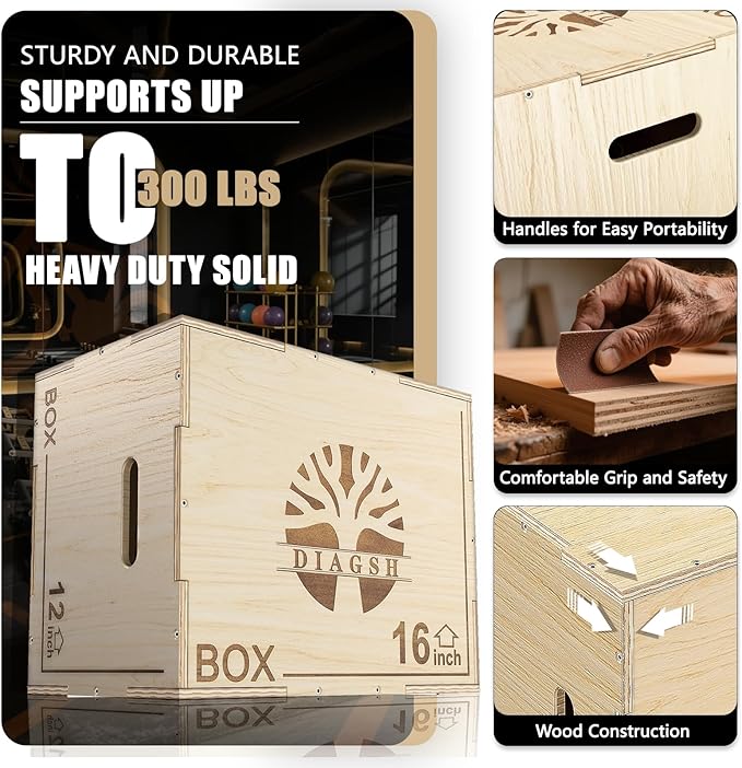 Plyo Box - 3-in-1 Wood Plyometric Jump Platform (16"x12"x8") for Home Gym Training - Ideal for Jumps, Squats & Conditioning-1 Piece