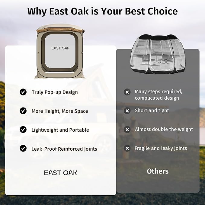 - ๐ฉ๐ฒ๐ฟ๐๐ฎ๐๐ถ๐น๐ฒ ๐๐น๐น-๐ถ๐ป-๐ข๐ป๐ฒ ๐ง๐ฒ๐ป๐: Engineered for complete outdoor protection, our tent features bug-proof mesh, waterproof walls, and wind-resistant construction. The expandable design offers extra space when needed, while vehicle-connect capability turns your car into a basecampโdelivering 360ยฐ coverage for all your adventures. One EAST OAK tent outperforms three ordinary tents.
