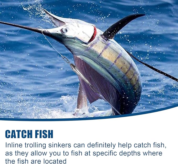- [STREAMLINED DESIGN] Inline trolling sinkers are the preferred choice for nearly all saltwater anglers. The sleek, torpedo-like design enables them to swiftly enter the water. With minimal resistance while gliding underwater, these sinkers can efficiently and silently present bait to larger fish, all while reducing the risk of getting snagged on rocks