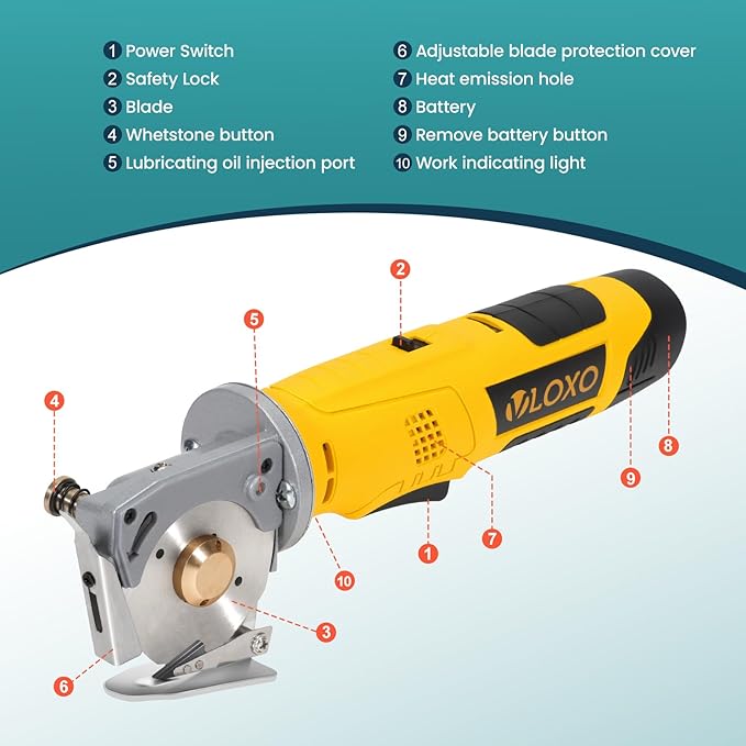 - Reliable Safety Lock: VLOXO electric rotary fabric scissors are designed for safe and secure use. We designed a unique safety lock for it. Let you enjoy the process of peace of mind, whether it is replacing the battery or the blade. After installing the battery, open the safety lock, and then turn on the power switch to work.