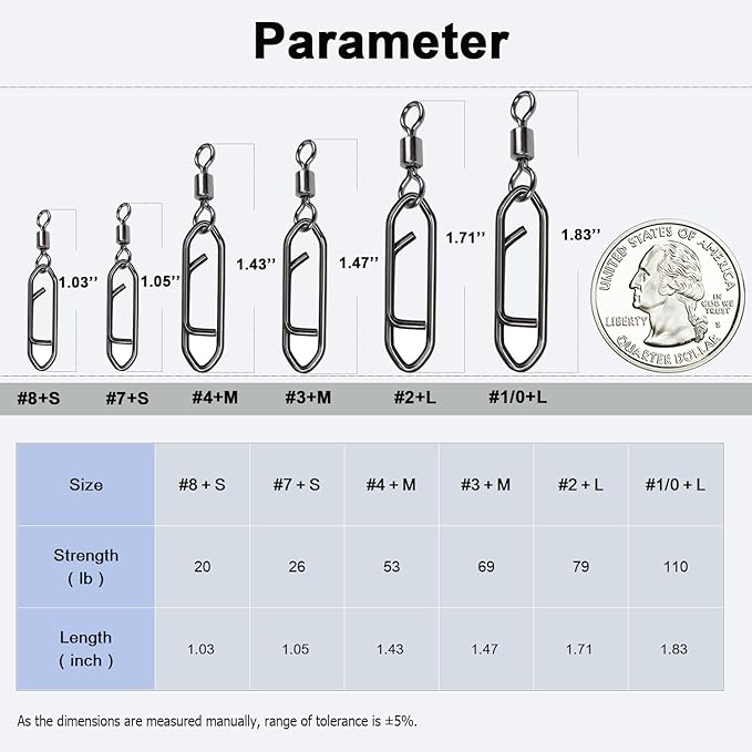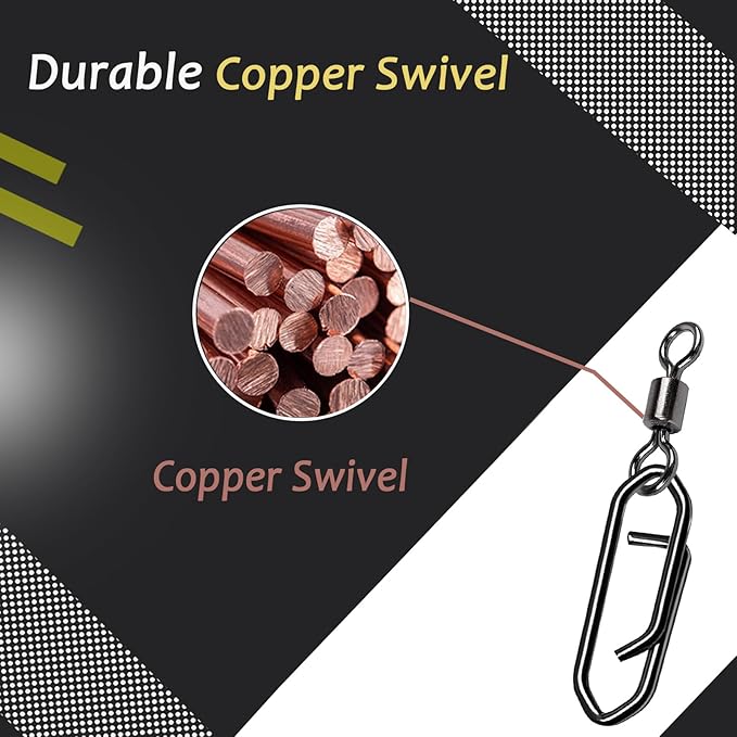 - Durable Construction and High Strength : Our swivels fishing snap are crafted from premium stainless steel and copper,ensuring they are built to last. Fishing clips swivels provide excellent protection against corrosion for longer corrosion resistant. These materials are chosen for fishing snaps clips exceptional strength and resistance to wear and tear,making fishing clips swivel ideal for the demanding conditions of saltwater and freshwater fishing.