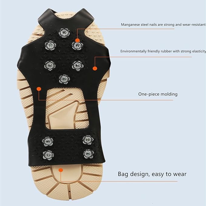 - Enhanced Traction with Stainless Steel Spikes: Featuring 10 high-quality stainless steel spikes (6 at the forefoot, 4 at the heel), these ice grippers for shoes deliver excellent grip and stability. Ideal for ice snow spikes for shoes, they help prevent slips and injuries on icy roads, snow-covered surfaces, or rugged terrains, making them perfect for clampons walking on ice or climbing
