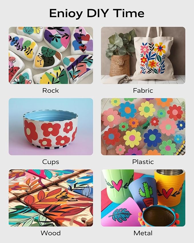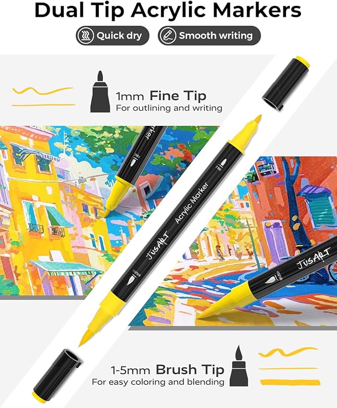 - 【Dual Tip Acrylic Paint Pens】Each acrylic marker come with a 1-5mm round nib and a 1mm fine nib. Dual tip design meets different coloring needs. The fine tip is suitable for outlining, fine line work; The brush tip works well for large areas of coloring, detailing. From delicate line work to bold sweeps, these markers adapt effortlessly to your artistic vision.