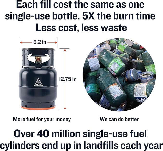 - 5-pound (1.2 gallon) refillable propane tank is more economical and less wasteful than single-use, 16-ounce “green” propane bottles and more portable than traditional 20-lb tanks