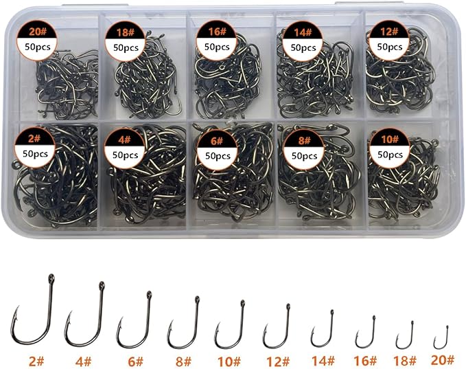 - What You Get: Package included 500pcs/pack. 50pcs each for 10 sizes in a box, 2#, 4#, 6#, 8#, 10#, 12#, 14#, 16#, 18#, 20#, you can choose hooks for different sizes in a variety of environments, large quantity