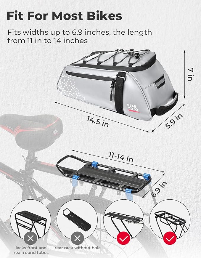 - Full Reflective Looks and Lightweight: (Supports Widths Up to 6.9 Inches for Bike Racks) The silver bicycle rear rack bag features an all-around fully reflective fabric, ensuring safety both day and night. It is very suitable for short-distance travel such as cycling and daily office commuting, allowing you to store small items needed for everyday journeys