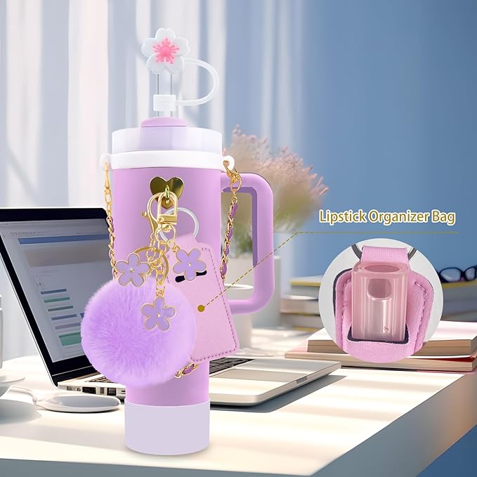 - 【Package Inside 】1 pcs water bottle handle strap, 1 pcs drawstring ring for the tumbler, 4 pcs silicone straw covers, 1 pcs flower keychain, 1 pcs pompom ball, 1pcs heart hook, 1 pcs silicone cup boot, 1 pcs lip balm sleeve