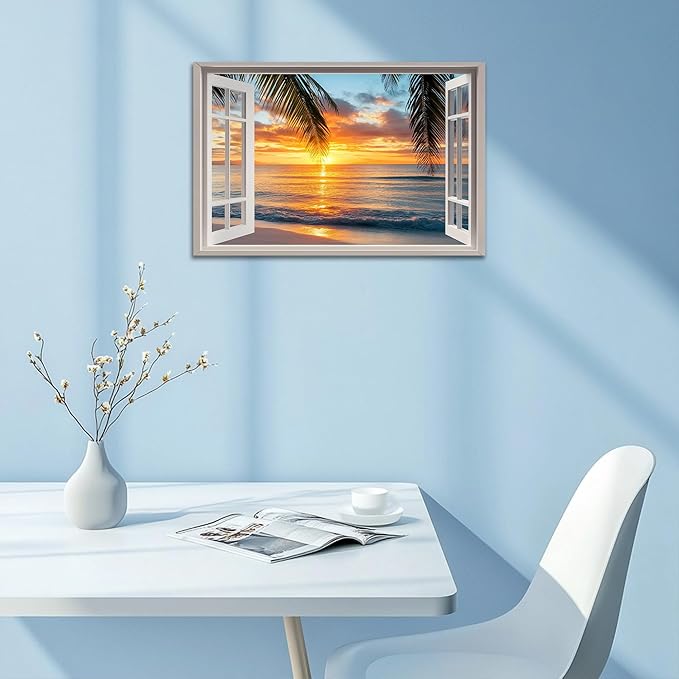 - 🏡Beach Pictures Prints Decor Space - Our window frame coastal wall art paintings will beautify your interior space and create an immersive 3D effect. Decorate your living space with fun, eye-catching, original window beach canvas wall art that makes a statement and tells a story, decorate your home with a magnificent masterpiece.