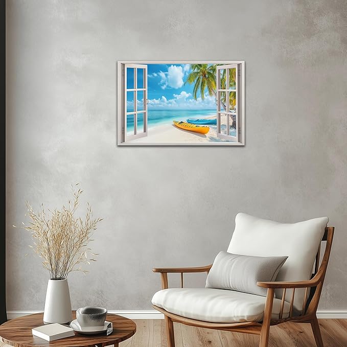 - 🏡Beach Pictures Prints Decor Space - Our window frame coastal wall art paintings will beautify your interior space and create an immersive 3D effect. Decorate your living space with fun, eye-catching, original window beach canvas wall art that makes a statement and tells a story, decorate your home with a magnificent masterpiece.