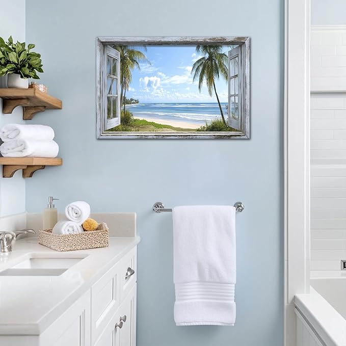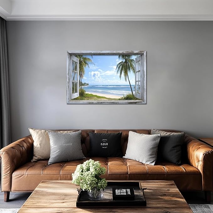 - 🏡Beach Pictures Prints Decor Space - Our window frame coastal wall art paintings will beautify your interior space and create an immersive 3D effect. Decorate your living space with fun, eye-catching, original window beach canvas wall art that makes a statement and tells a story, decorate your home with a magnificent masterpiece.