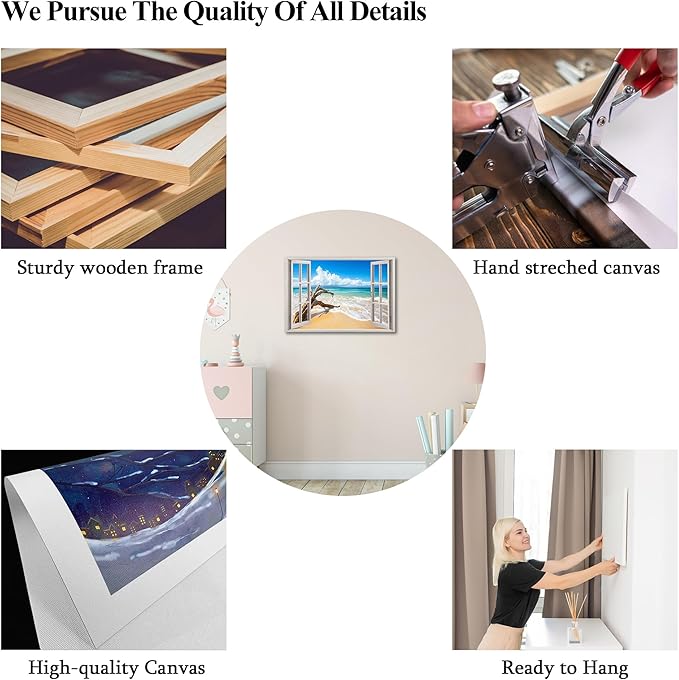 - 🎁Great Gift of Choice - Canvas wall decorations will never go out of style as holiday gifts. Our window frame coastal beach wall art paintings will beautify your interior space and create an immersive 3D effect. They are mainly used to decorate bedrooms, bathrooms, living rooms, kitchens, offices and restaurants, etc. They make ideal Valentine's Day, Halloween, Christmas and New Year's gifts for friends and family.