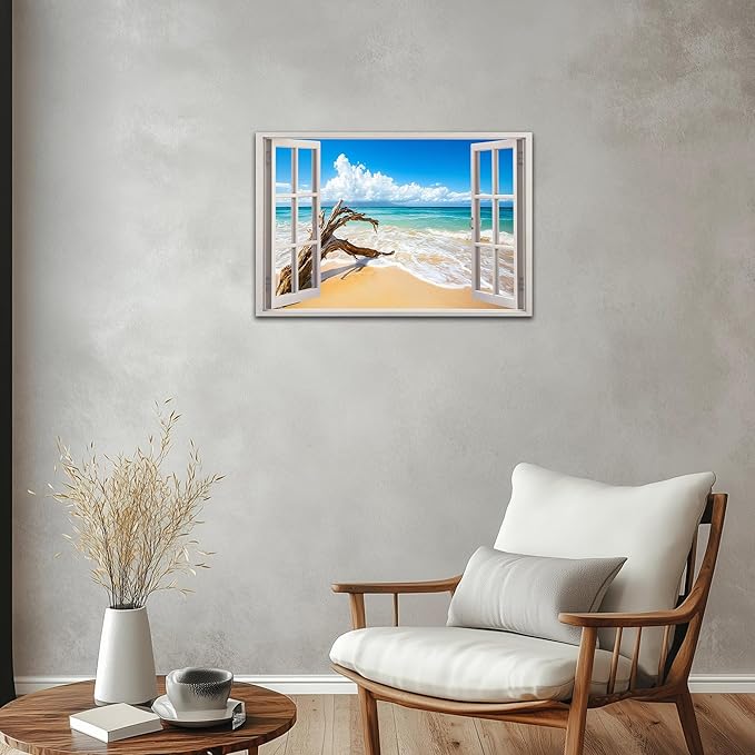 - 🏡Beach Pictures Prints Decor Space - Our window frame coastal wall art paintings will beautify your interior space and create an immersive 3D effect. Decorate your living space with fun, eye-catching, original window beach canvas wall art that makes a statement and tells a story, decorate your home with a magnificent masterpiece.