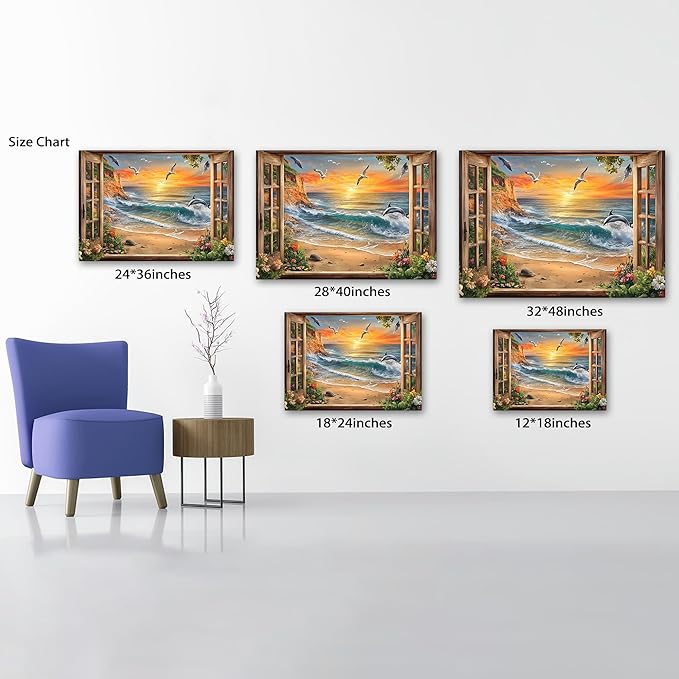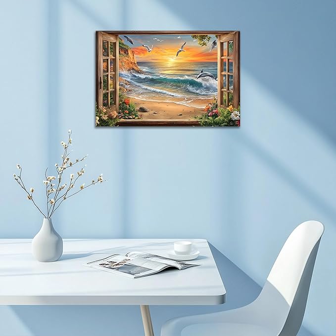 - 🏡Beach Pictures Prints Decor Space - Our window frame coastal wall art paintings will beautify your interior space and create an immersive 3D effect. Decorate your living space with fun, eye-catching, original window beach canvas wall art that makes a statement and tells a story, decorate your home with a magnificent masterpiece.