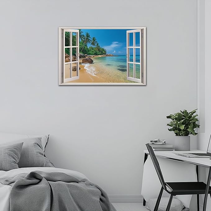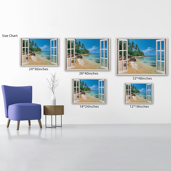 - 🏡Beach Pictures Prints Decor Space - Our window frame coastal wall art paintings will beautify your interior space and create an immersive 3D effect. Decorate your living space with fun, eye-catching, original window beach canvas wall art that makes a statement and tells a story, decorate your home with a magnificent masterpiece.