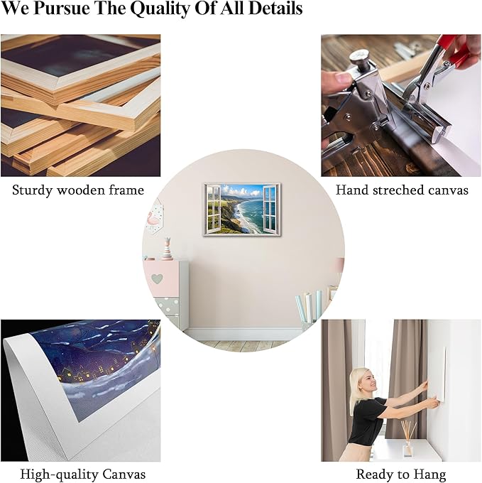 - 🎁Great Gift of Choice - Canvas wall decorations will never go out of style as holiday gifts. Our window frame coastal beach wall art paintings will beautify your interior space and create an immersive 3D effect. They are mainly used to decorate bedrooms, bathrooms, living rooms, kitchens, offices and restaurants, etc. They make ideal Valentine's Day, Halloween, Christmas and New Year's gifts for friends and family.