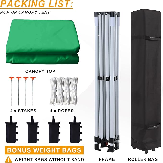 - ✅PACKAGE INCLUDED: a 10x10 frame, a canopy cover, a heavy duty roller bag, 4 useful ropes,stakes and sandbags for canopy tent’s security and stability.