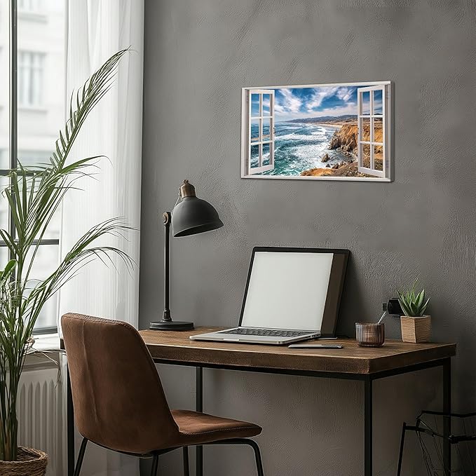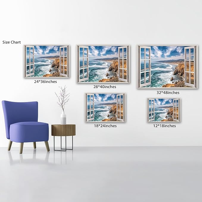 - 🏡Beach Pictures Prints Decor Space - Our window frame coastal wall art paintings will beautify your interior space and create an immersive 3D effect. Decorate your living space with fun, eye-catching, original window beach canvas wall art that makes a statement and tells a story, decorate your home with a magnificent masterpiece.