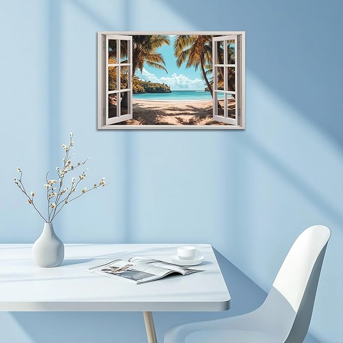 - 🏡Beach Pictures Prints Decor Space - Our window frame coastal wall art paintings will beautify your interior space and create an immersive 3D effect. Decorate your living space with fun, eye-catching, original window beach canvas wall art that makes a statement and tells a story, decorate your home with a magnificent masterpiece.