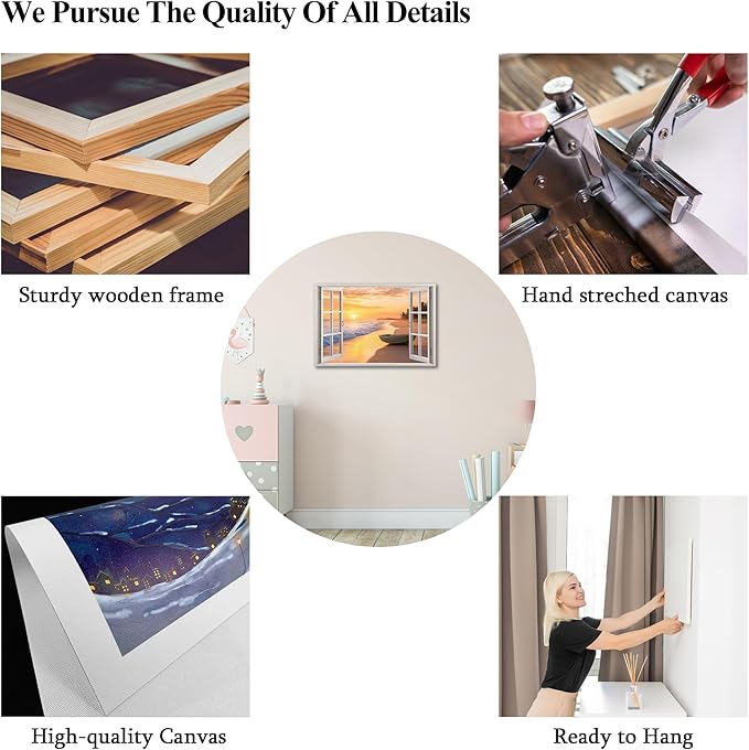 - 🎁Great Gift of Choice - Canvas wall decorations will never go out of style as holiday gifts. Our window frame coastal beach wall art paintings will beautify your interior space and create an immersive 3D effect. They are mainly used to decorate bedrooms, bathrooms, living rooms, kitchens, offices and restaurants, etc. They make ideal Valentine's Day, Halloween, Christmas and New Year's gifts for friends and family.