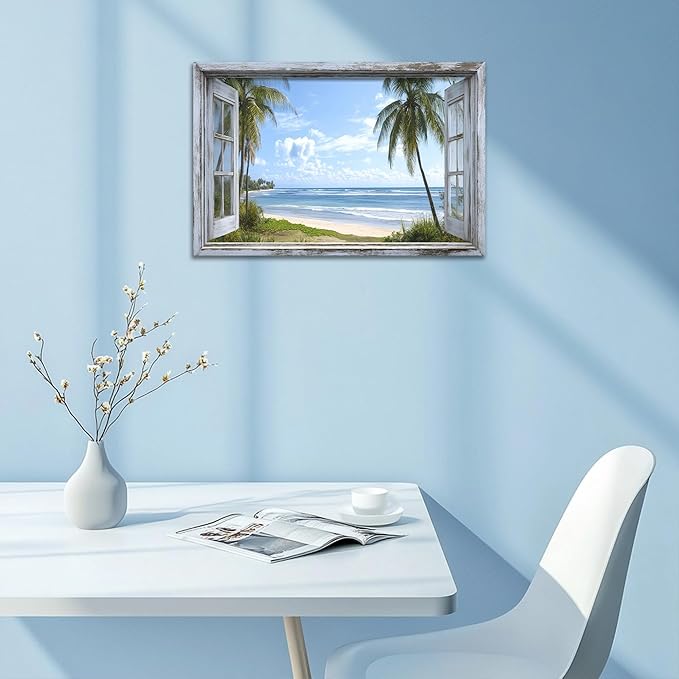 - 🏡Beach Pictures Prints Decor Space - Our window frame coastal wall art paintings will beautify your interior space and create an immersive 3D effect. Decorate your living space with fun, eye-catching, original window beach canvas wall art that makes a statement and tells a story, decorate your home with a magnificent masterpiece.