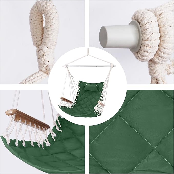 Hammock Chair Hanging Swing with Wooden Armrests;Steel Spreader Bar,Pillows,Hardware kit Included;Cotton Woven ;Up to 350 Lbs,for Indoor Outdoor Green