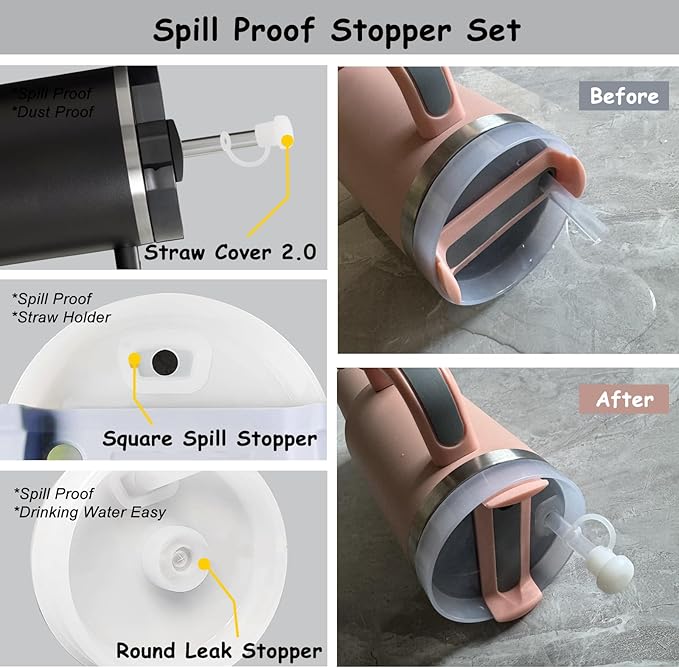 - Complete Package: Vikgle Stanley Cup Accessories Set, include 2pcs 0.4 Inch/10 mm Straw Cover Cap, 1pcs Cute Handle Charm, Spill Proof Stopper Set of 3pcs and 1Pcs Silicone Boot. Suitable for Stanley Quencher 30/40 oz and Stanley IceFlow 20/30 oz tumblers water bottles & others cup bottom diameter 2.75-2.95 inch