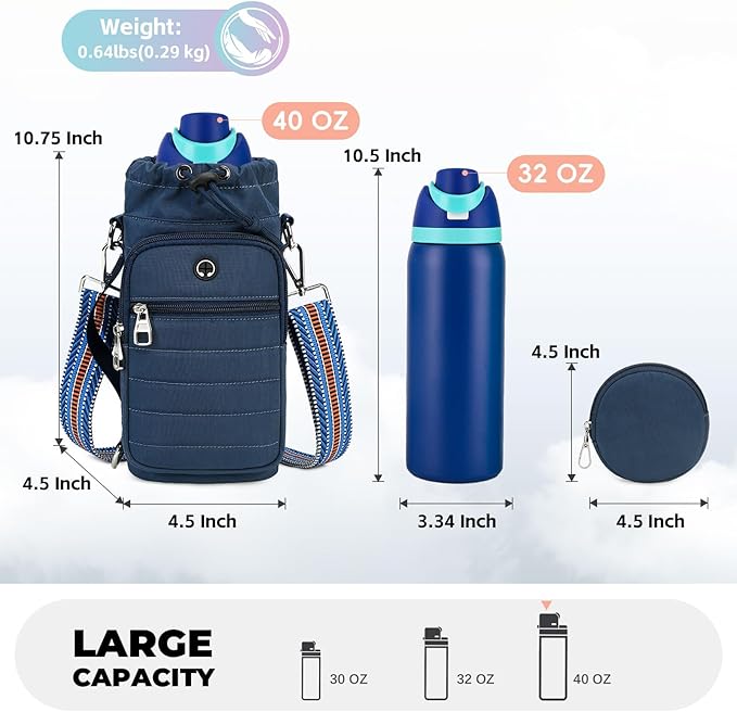 - 【Protect Your Water Bottle Bag】Features a drawstring design to keep your water bottle secure and reliable. The water bottle carrier bag measures 4.5 x 4.5 x 10.75" and is designed to hold vacuum bottles, sports bottles, milk bottles, and suitable for a variety of bottles up to 40oz (NO Handle)Base Width: ≤4". Could free your hands and offering superior protection against drops and silence when setting down