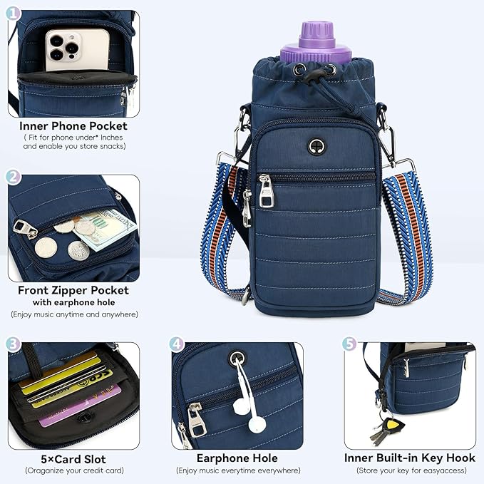 - 【Portable and Hands-Free Handle Strap】This water bottle crossbody bag comes with 2 different sized straps, One handle strap and adjustable shoulder / crossbody strap ( adjusted between 29.9" and 55.1" )which make you wear your drink like a purse and a shorter strap for carrying the cup by hand. Whether you prefer to hold it in your hand or wear it on your body, our water bottle sling bag is designed to fit all body types
