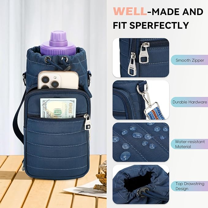 - 【Water Bottle Carrier Bag with Phone Pocket】Multiple Pockets + Small Wallet. The main pocket features a convenient drawstring closure to insert and remove your bottle. Designed with two zippered pocket , including a upgraded phone pocket while another zippered pocket &small wallet provide enough room for little stuff as cash, ID, credit card, work badge, coin, lipstick and some other small things