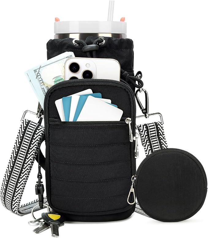 - 【Water Bottle Carrier Bag with Phone Pocket】Multiple Pockets + Small Wallet. The main pocket features a convenient drawstring closure to insert and remove your bottle. Designed with two zippered pocket , including a upgraded phone pocket while another zippered pocket &small wallet provide enough room for little stuff as cash, ID, credit card, work badge, coin, lipstick and some other small things