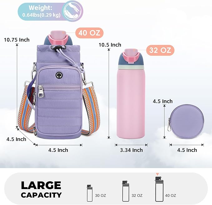 - 【Protect Your Water Bottle Bag】Features a drawstring design to keep your water bottle secure and reliable. The water bottle carrier bag measures 4.5 x 4.5 x 10.75" and is designed to hold vacuum bottles, sports bottles, milk bottles, and suitable for a variety of bottles up to 40oz (NO Handle)Base Width: ≤4". Could free your hands and offering superior protection against drops and silence when setting down