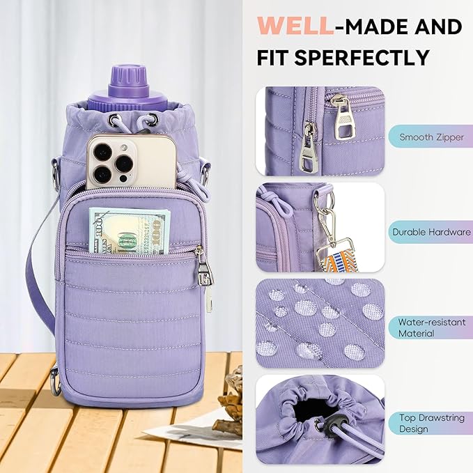 - 【Water Bottle Carrier Bag with Phone Pocket】Multiple Pockets + Small Wallet. The main pocket features a convenient drawstring closure to insert and remove your bottle. Designed with two zippered pocket , including a upgraded phone pocket while another zippered pocket &small wallet provide enough room for little stuff as cash, ID, credit card, work badge, coin, lipstick and some other small things