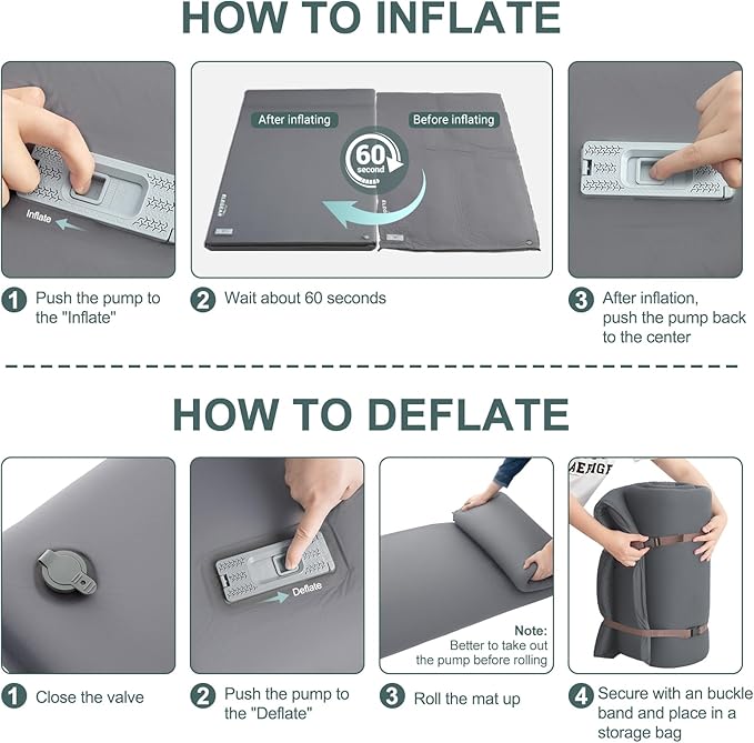 - Built-in Electric Pump for Effortless Storage: Elegear double sleeping pad comes with a built-in electric pump, realizing one-touch inflation and deflation, vacuum compression storage can greatly save storage space. With our camping sleeping pads, you'll say goodbye to the laborious inflating and storage, getting the best camping experience. NOTE: The endurance of the pump is 20 mins, and it takes 1 min to inflate and 2 min to deflate, please keep an eye on the power level when using it.