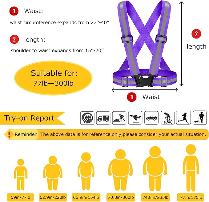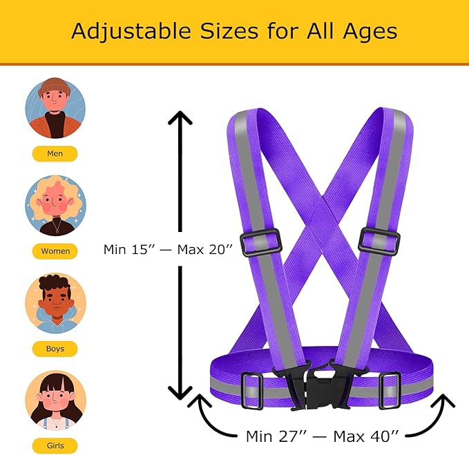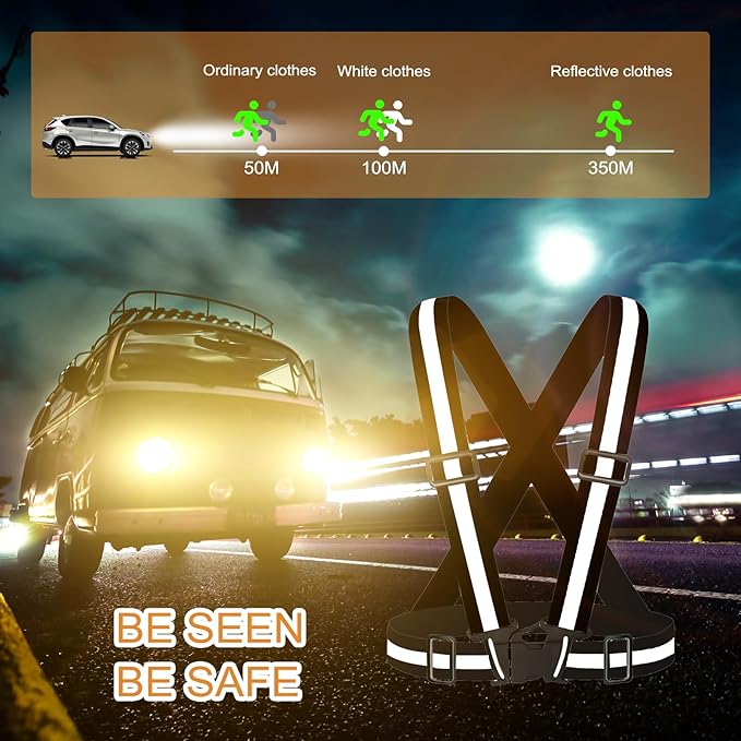 - High Visibility Vests -Our reflective straps are made of high quality nylon fabric, reflective safety vests feature bright yellow fluorescent bands and super bright reflective silver stripes, and belt buckles and belt adjusters are made of hard plastic. Reusable. A 360-degree reflective vest will keep you safe in all weather conditions. The super reflective running gear can be seen from 800 feet or more.