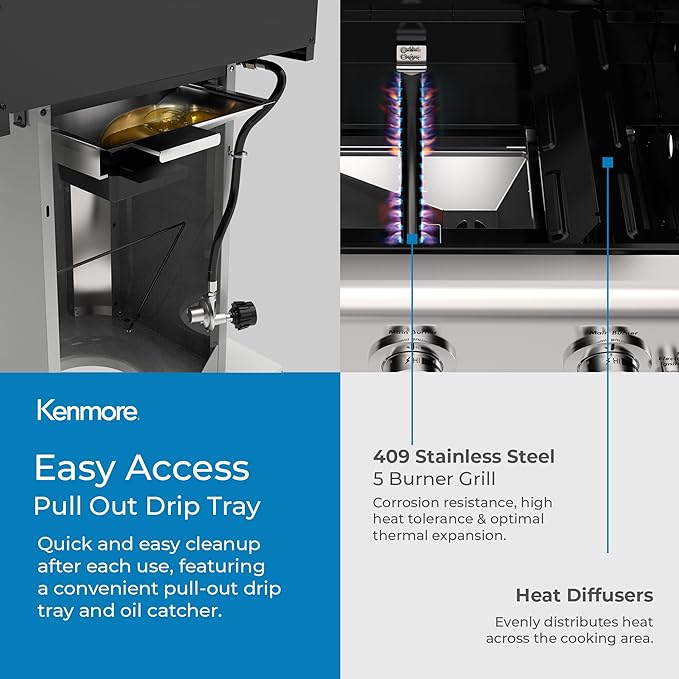 - INCLUDES CAST-IRON COOKING GRATES & WARMING RACK – Savor the perfect barbecue with the Kenmore gas grill! With its cast-iron cooking grates, you can say goodbye to unevenly cooked burgers and hello to evenly distributed and retained heat. Plus, don't forget the bonus warming rack, boasting a roomy 131 square inches of extra cooking space and perfect for keeping food warm until everyone is ready to dig in. Bring on the backyard barbecue fun!