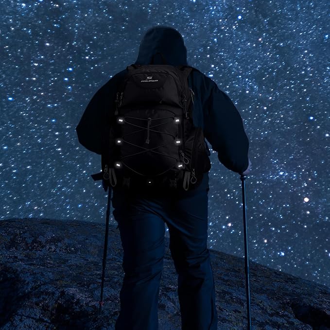 - Unique Functional Design:The main pocket of the camping backpack has a Velcro strap for binding the water bag liner and a hose hole on the top side for assembling the water bag system; the side straps and buckles can be used to fix water bottles or trekking poles, and the bottom straps can be used to fix a tripod or a sleeping pad; finally, there is a reflective logo printed on the backpack to remind people to pay attention to safety