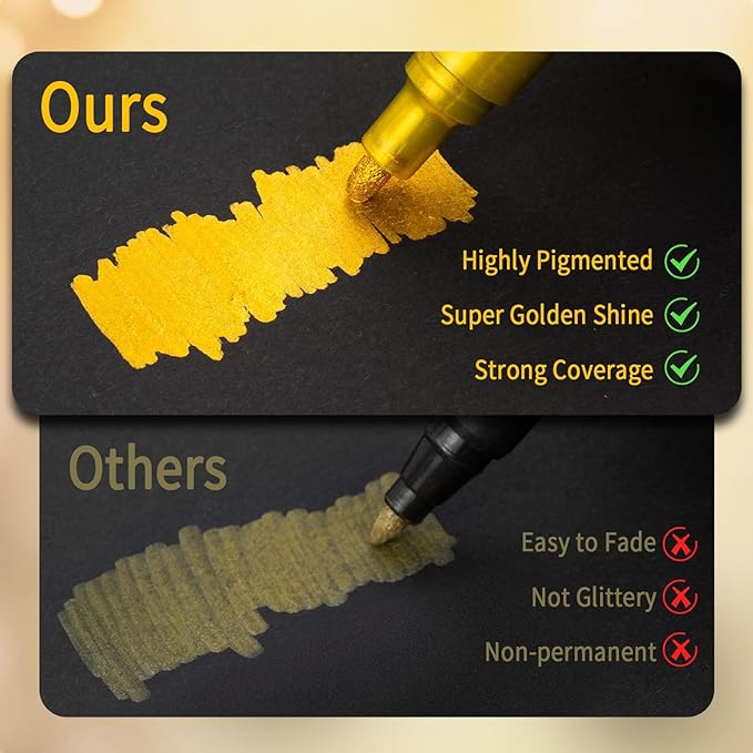 - 【Enhanced Metallic Brilliance】Betem metallic acrylic paint pens come in 12 highly pigmented vibrant metallic colors, perfect for adding a sparkling metallic sheen to your artistic creations. Compared to regular metallic markers, our super golden makers offer a brighter, more brilliant, ultra-glittery metallic effect. Perfect for expressing your creativity and bringing art to life.