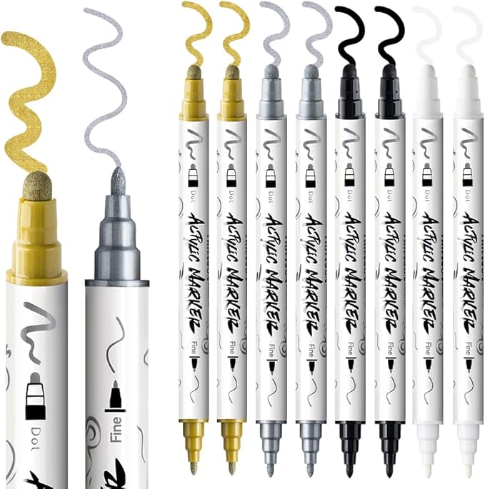 - This dual tip acrylic paint pen set includes: 2 gold, 2 silver, 2 black and 2 white acrylic paint markers. Dual felt tips: one end with 0.7-1mm(approx.) fine tip, the other end with 3-5mm(approx.) bold tip.