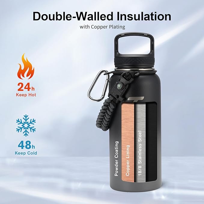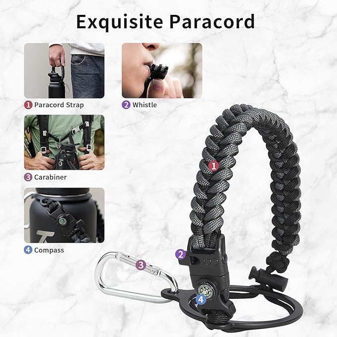 - Full-function Paracord Handle: 32 ounce water bottle come with paracord handle the brilliant paracord of matching colors bring out the bottle with a touch of youthful vibe. Compact compass and handy carabiner make the bottle the ideal survival kit for expeditions in the wild.