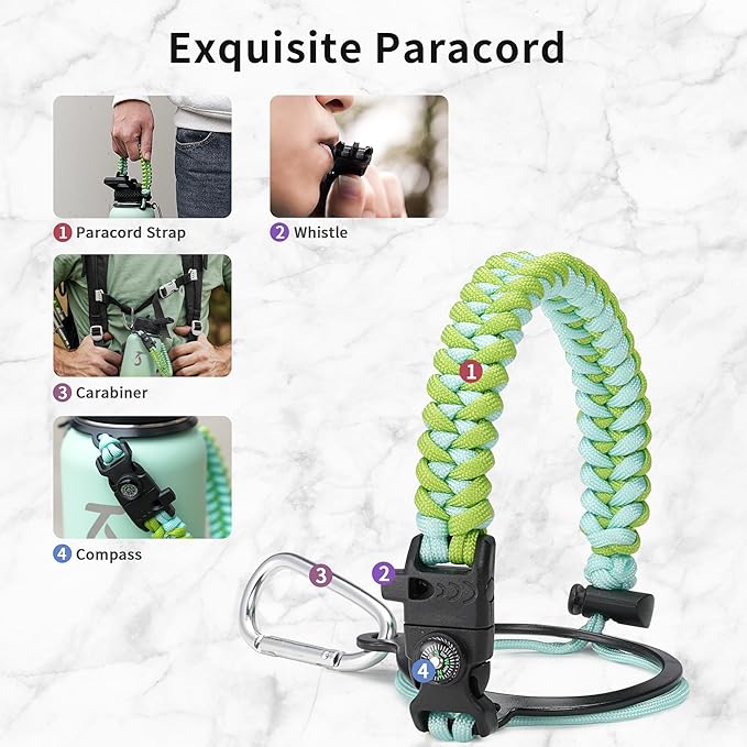 - Full-function Paracord Handle: 40 ounce water bottle come with paracord handle the brilliant paracord of matching colors bring out the bottle with a touch of youthful vibe. Compact compass and handy carabiner make the bottle the ideal survival kit for expeditions in the wild.