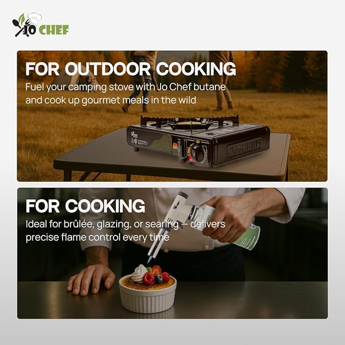 - BUTANE FOR TORCH ATTACHMENT - Get cooking in the wild or go gourmet in your kitchen! Click the butane onto your kitchen torch head or use as butane camping fuel. Jo Chef kitchen torch butane canisters are safe and easy to use anywhere.