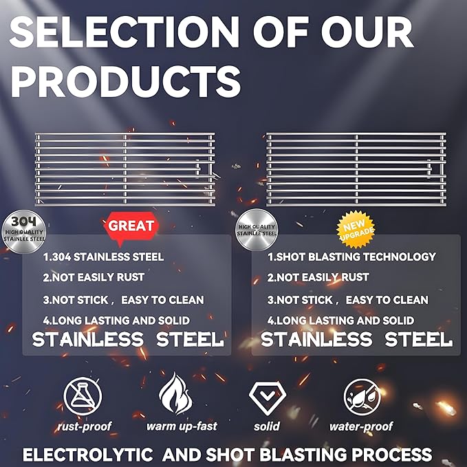 - [Premium Stainless Steel with Advanced Craftsmanship]:We offer two versions of the Blaze Rod Grill Grate: the Upgraded Shot Blasting + High-Quality Stainless Steel version and the 304 Stainless Steel version. The Upgraded Version (Shot Blasting + High-Quality Stainless Steel) is treated with shot blasting, enhancing the surface hardness and wear resistance, offering superior durability and corrosion resistance. The 304 Stainless Steel Version uses high-quality 304 material, providing excellent high-temperature resistance and rust prevention, ensuring long-term use and a perfect grilling experience every time