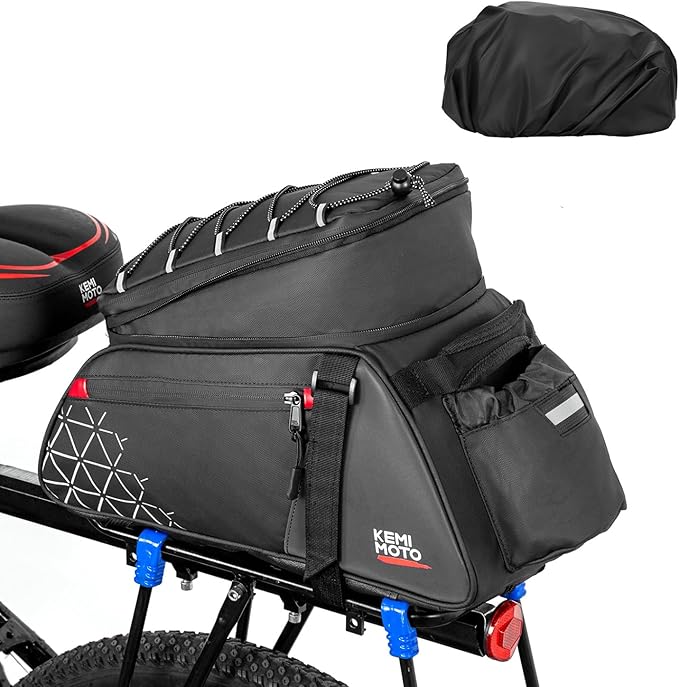 - Lightweight Bike Bag: The KEMIMOTO bike rear rack bag has an overall capacity of 15L. A tie rope has been added on the top for extra storage, along with additional zipper pockets on the side and a hidden pocket underneath for a chest strap